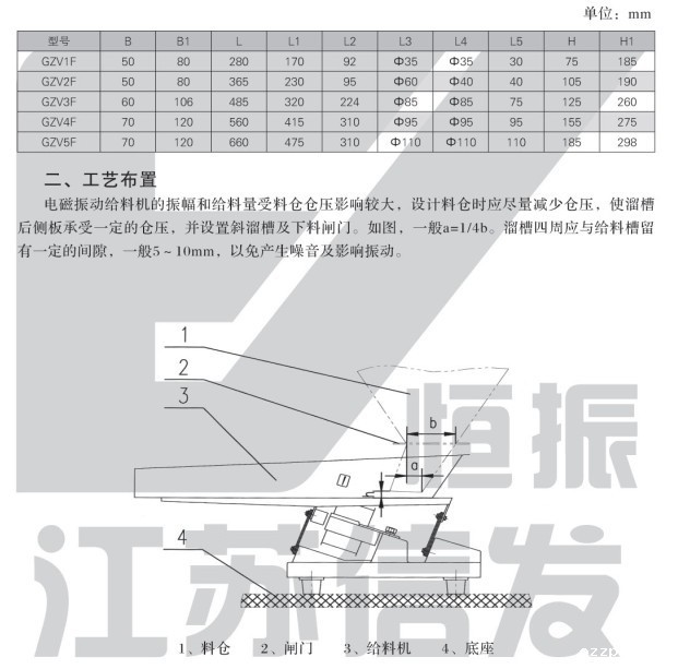星空体育预测软件下载的振幅和给料量受料仓仓压影响较大,设计料仓时应尽量减少仓压,使溜咀后侧板承受一定的仓压,并设置斜溜沮及下料闸门。如图,一般a=1/4b。溜咀四周应与给料槽留有一定的间隙,一般5~10mm,以免产生噪音及影响振动。